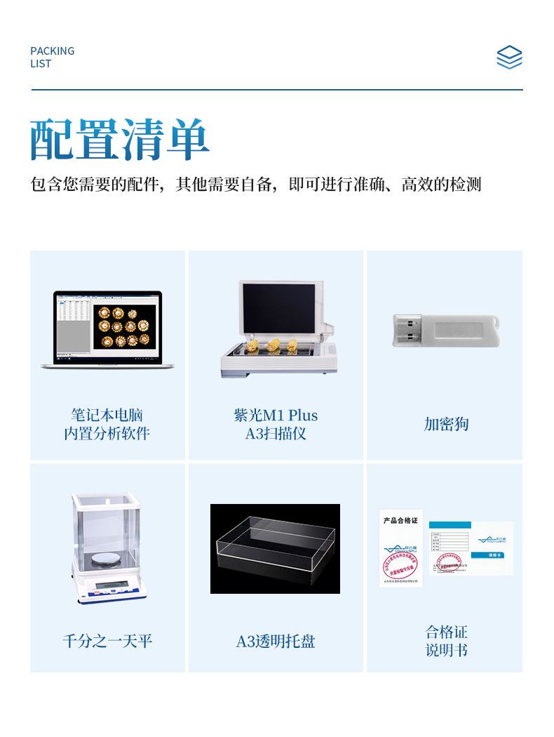 配置清單:筆記本電腦(內(nèi)置分析軟件)、紫光M1 Plus掃描儀(A3)、加密狗、千分之一天平、A3透明托盤、合格證、說明書