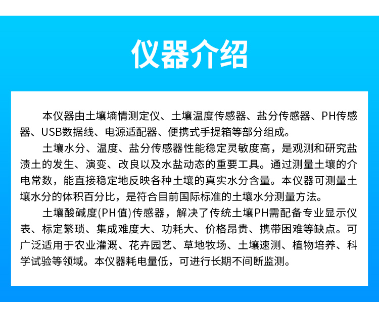 土壤水分溫度鹽分PH測(cè)定儀采用一體化結(jié)構(gòu)設(shè)計(jì),可快速準(zhǔn)確測(cè)量土壤中含水量、溫度、電導(dǎo)率(鹽分)、酸堿度,可對(duì)多處樣地、不同土壤深度的水分含量溫度鹽分和PH進(jìn)行快速檢測(cè)和長期連續(xù)監(jiān)測(cè)。廣泛應(yīng)用于土壤墑情檢測(cè)、旱作節(jié)水灌溉、精細(xì)農(nóng)業(yè)、林業(yè)、地質(zhì)勘探、植物培育、水利、環(huán)保等領(lǐng)域。