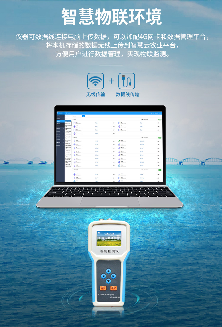1、☆儀器可加配4G聯(lián)網(wǎng)功和能數(shù)據(jù)管理平臺(tái),將本機(jī)存儲(chǔ)的被測(cè)點(diǎn)環(huán)境因子測(cè)量歷史數(shù)據(jù)無線上傳到智慧云農(nóng)業(yè)平臺(tái),方便用戶進(jìn)行數(shù)據(jù)管理和長期分析。