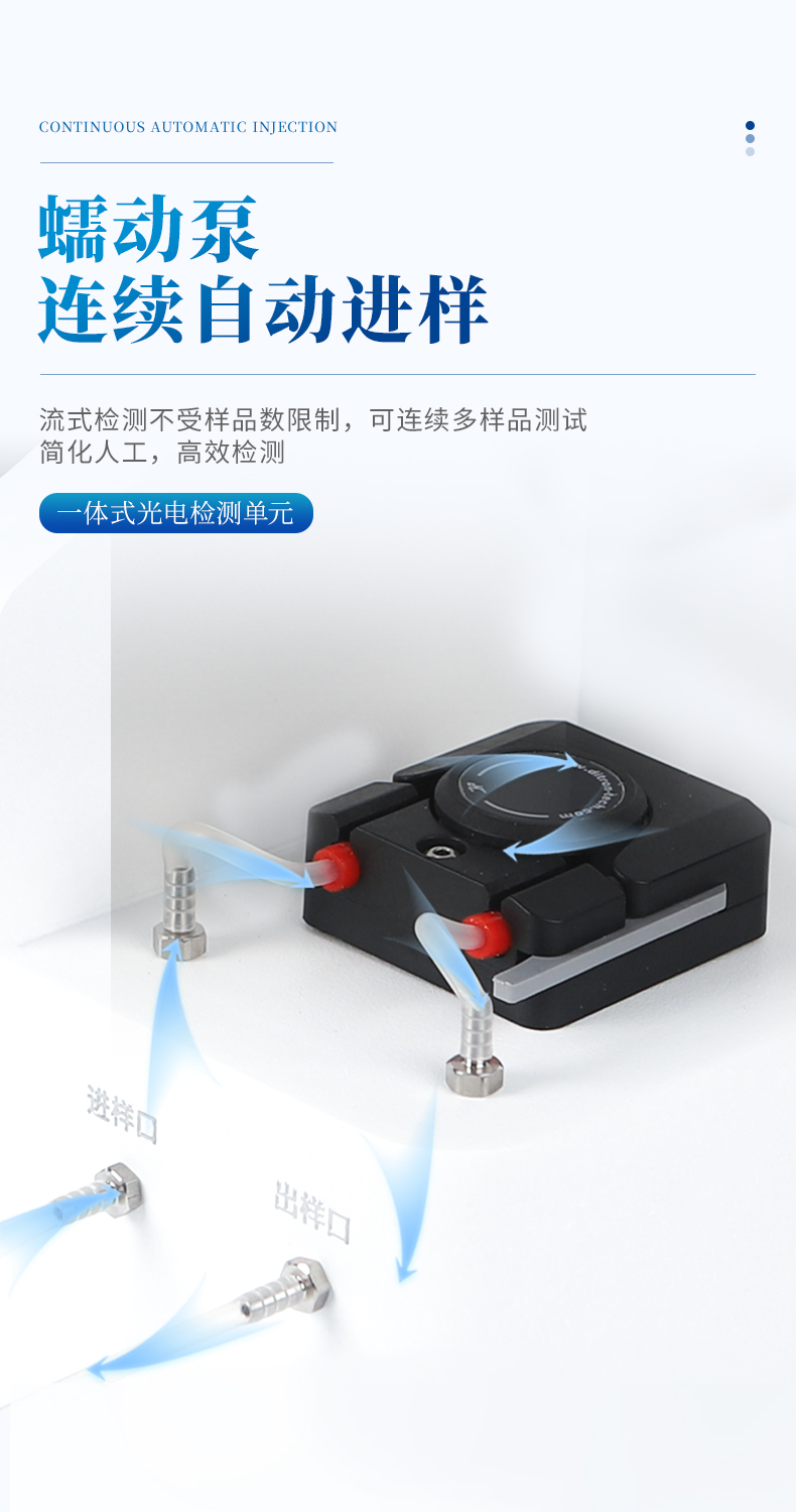 2、★采用蠕動(dòng)泵連續(xù)自動(dòng)進(jìn)樣,流式檢測不受樣品數(shù)限制,可連續(xù)多樣品測試。
