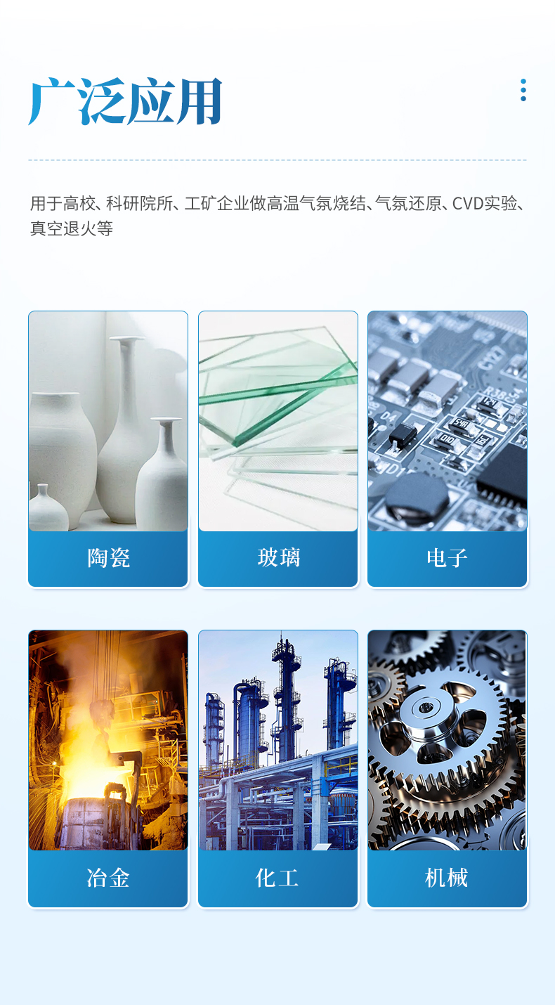 用于高校、科研院所、工礦企業(yè)做高溫氣氛燒結(jié)、氣氛還原、CVD實驗、真空退火等。具有溫場均勻、升降溫速率快、節(jié)能、可通入多重氣體等特點。