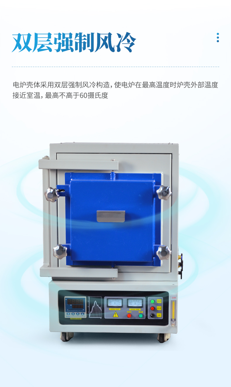 電爐殼體采用雙層強制風(fēng)冷構(gòu)造,使電爐在最高溫度時爐殼外部溫度接近室溫,最高不高于60攝氏度。