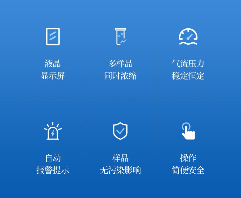 3、工作參數(shù)任意設(shè)置、控制和實時顯示:主要工作參數(shù):氮吹壓力、水浴溫度和工作時間,均可按需設(shè)置。
