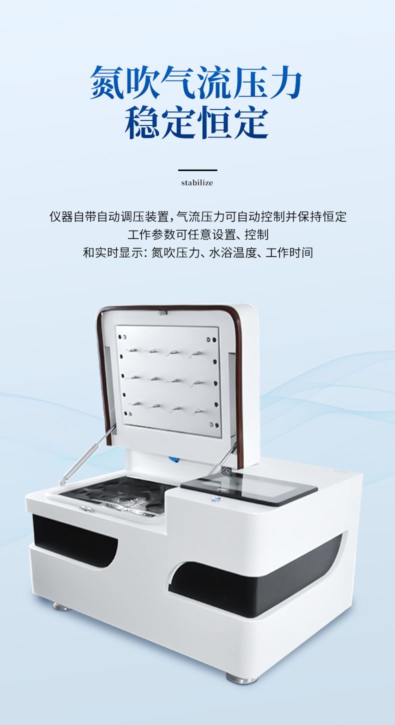 4、氮吹氣流壓力穩(wěn)定、恒定:儀器自帶自動調(diào)壓裝置,氣流壓力可自動控制并保持恒定,不受工作通道(樣品)突然開啟、關(guān)閉或數(shù)量的影響;