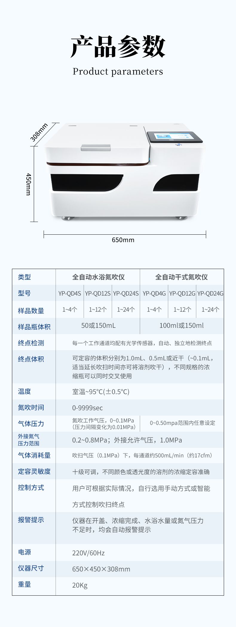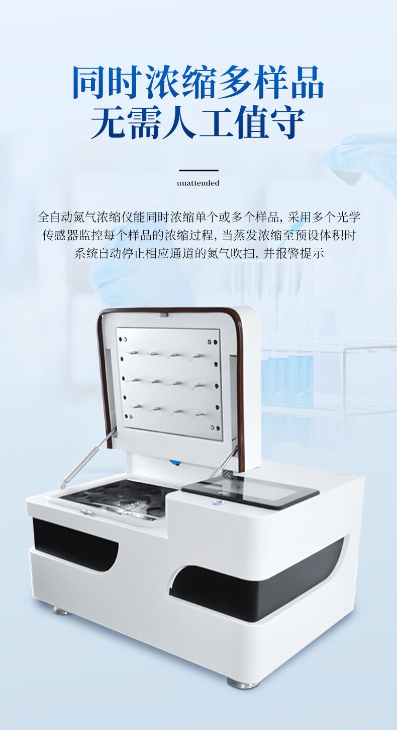 全自動多功能干式氮吹儀YP-QD12G是我司結(jié)合實(shí)驗(yàn)室使用需求,從使用者方便安全快捷穩(wěn)定等多角度共同開發(fā)的新型濃縮定容產(chǎn)品,產(chǎn)品擺脫了常規(guī)市場上利用水浴加熱揮發(fā)而導(dǎo)致樣品進(jìn)行污染的弊端,確定樣品的安全性與準(zhǔn)確性,具有無人值守、準(zhǔn)確定容、大批量濃縮的特點(diǎn),可多組數(shù)據(jù)儲存功能,實(shí)現(xiàn)了全自動化的定量及批量濃縮,濃縮全程,讓繁瑣的濃縮過程變得靈活、省心、高效和安全。