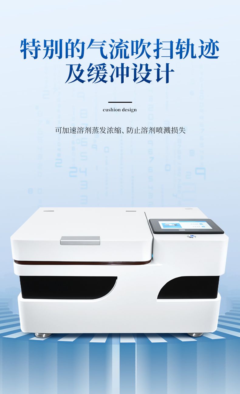4、終點(diǎn)體積:自動感應(yīng)的定容體積人別為1.0ml、0.5ml或近干(約0.1ml,定容規(guī)格選配),適當(dāng)延長時間亦可將溶劑吹干,不同規(guī)格的濃縮瓶可以同時交叉使用;