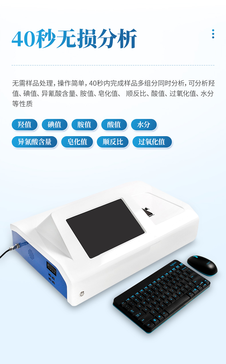 無需樣品處理,操作簡單,快速分析,40秒內(nèi)完成樣品多組分 同時分析,可分析羥值、碘值、異氰酸含量、胺值、皂化值、 順反比、酸值、過氧化值、水分等性質(zhì)