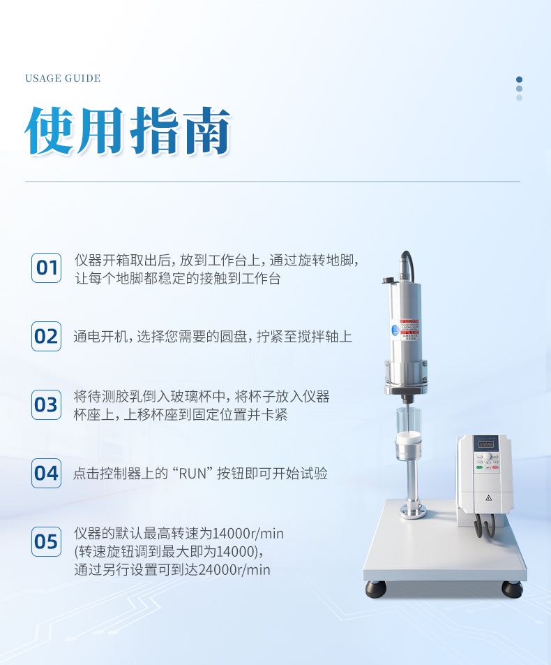 儀器開箱取出后,放到工作臺(tái)上,通過旋轉(zhuǎn)地腳,讓每個(gè)地腳都穩(wěn)定的接觸到工作臺(tái),通電開機(jī),選擇您需要的圓盤,擰緊至攪拌軸上,將待測(cè)膠乳倒入玻璃杯中,將杯子放入儀器杯座上,上移杯座到固定位置并卡緊,點(diǎn)擊控制器上面的“RUN”按鈕即可開始試驗(yàn)。儀器的默認(rèn)最高轉(zhuǎn)速為14000r/min(轉(zhuǎn)速旋鈕調(diào)到最大即為14000),通過另行設(shè)置可到達(dá)24000r/min。
