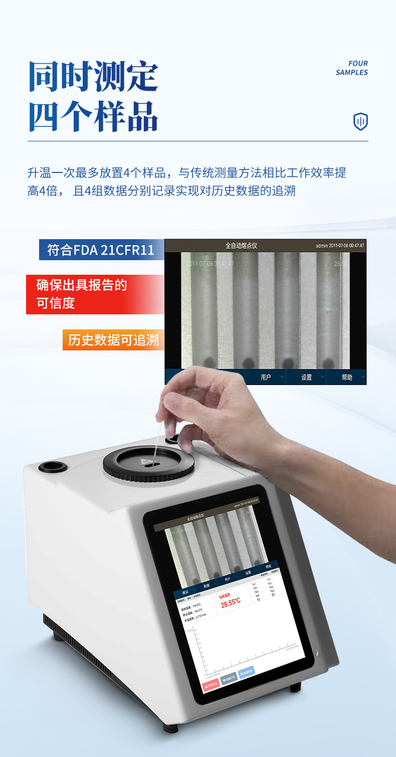 升溫一次最多放置4個(gè)樣品,與傳統(tǒng)測(cè)量方法相比工作效率提高4倍,且4組數(shù)據(jù)分別記錄實(shí)現(xiàn)對(duì)歷史數(shù)據(jù)的追溯,符合FDA 21CFR11確保出具報(bào)告的可信度。