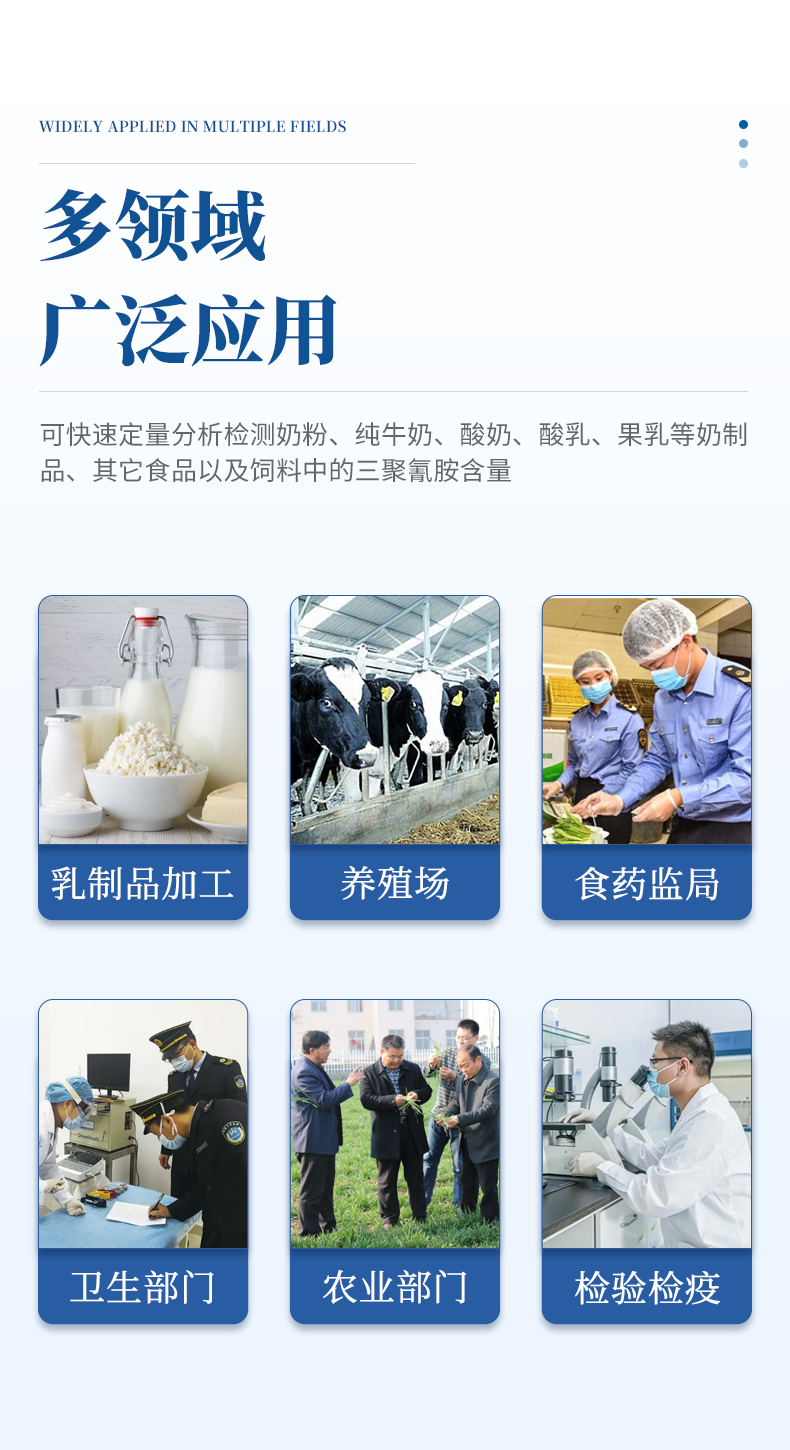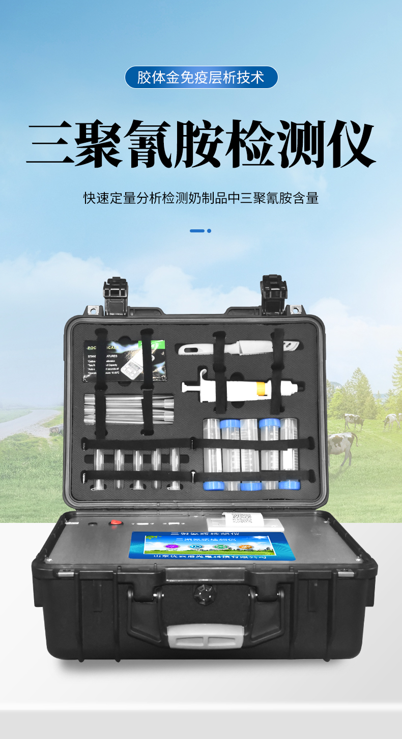 三聚氰胺檢測儀可快速定量分析檢測奶粉、純牛奶、酸奶、酸乳、果乳等奶制品、其它食品以及飼料中的三聚氰胺含量。從原料采購到成品檢驗(yàn)均可使用,三聚氰胺檢測儀廣泛應(yīng)用于乳制品加工、養(yǎng)殖場、食藥監(jiān)局、衛(wèi)生部門、農(nóng)業(yè)部門、檢驗(yàn)檢疫等部門使用。