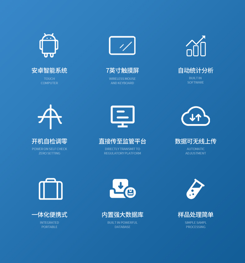 2、智能化程度高,儀器具有自檢功能:具有開機(jī)自檢和調(diào)零功能,具有自動(dòng)檢測重復(fù)性功能。