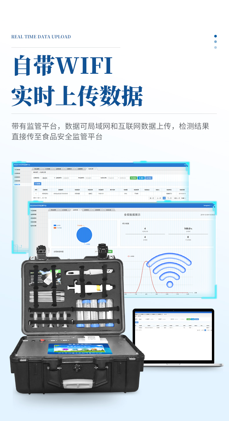 4、儀器帶有監(jiān)管平臺,數(shù)據(jù)可局域網(wǎng)和互聯(lián)網(wǎng)數(shù)據(jù)上傳,檢測結(jié)果直接傳至食品安全監(jiān)管平臺。進(jìn)行區(qū)域食品安全監(jiān)管及大數(shù)據(jù)分析處理與數(shù)據(jù)統(tǒng)計(jì),檢測區(qū)域食品安全長短期動(dòng)態(tài),達(dá)到食品安全問題預(yù)估、預(yù)警