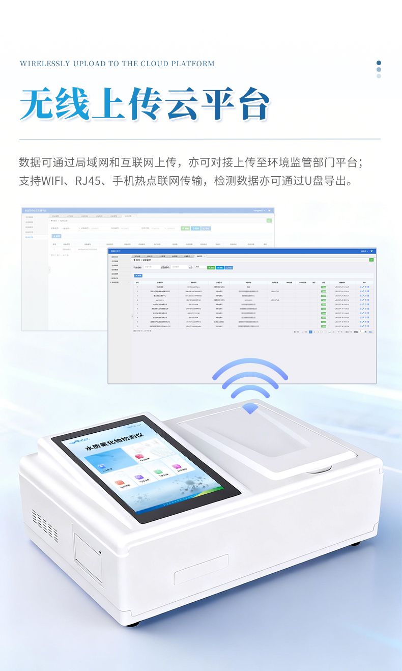 8.儀器帶有監(jiān)管云平臺,數(shù)據(jù)可通過局域網(wǎng)和互聯(lián)網(wǎng)上傳,亦可對接上傳至環(huán)境監(jiān)管部門平臺。