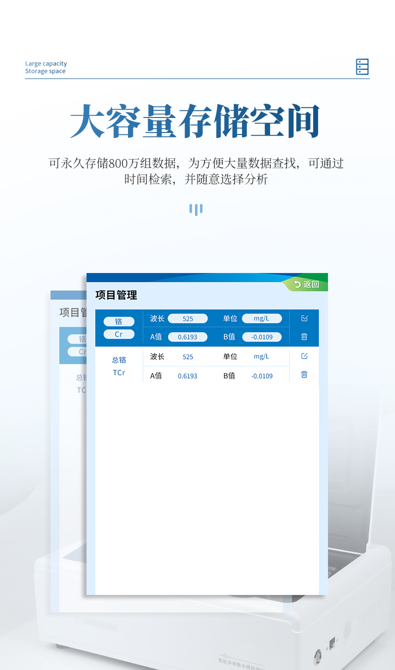 主要檢測水質(zhì)六價鉻重金屬含量指標,兼具智能數(shù)據(jù)分析功能,圖表、列表顯示數(shù)據(jù),分析一目了然;高清晰度彩色液晶觸摸顯示屏,Android智能操作系統(tǒng),中文顯示界面,中英文鍵盤,人性化操作,使用更簡單。