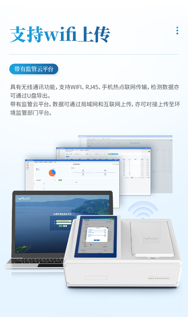 ②配置云監(jiān)控平臺(tái),檢測(cè)結(jié)果可直接無線傳至平臺(tái),進(jìn)行水質(zhì)長(zhǎng)短期分析,輔助管理。