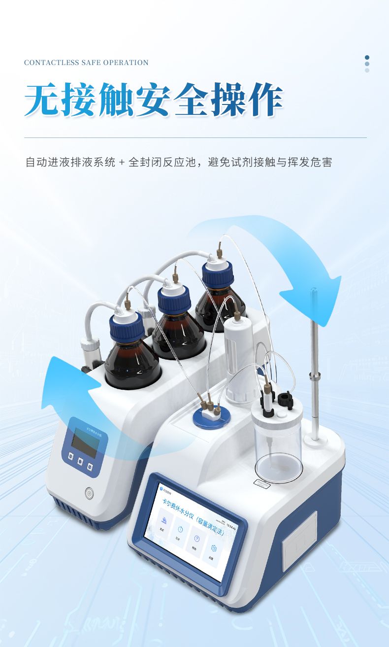 3.儀器采用全密封滴定池瓶,避免試劑與人接觸,杜絕環(huán)境濕度對(duì)檢測(cè)的影響;檢測(cè)過(guò)程中儀器自動(dòng)控制,攪拌、測(cè)定60秒左右完成,可直接顯示測(cè)定結(jié)果,無(wú)需人員頻繁操作。