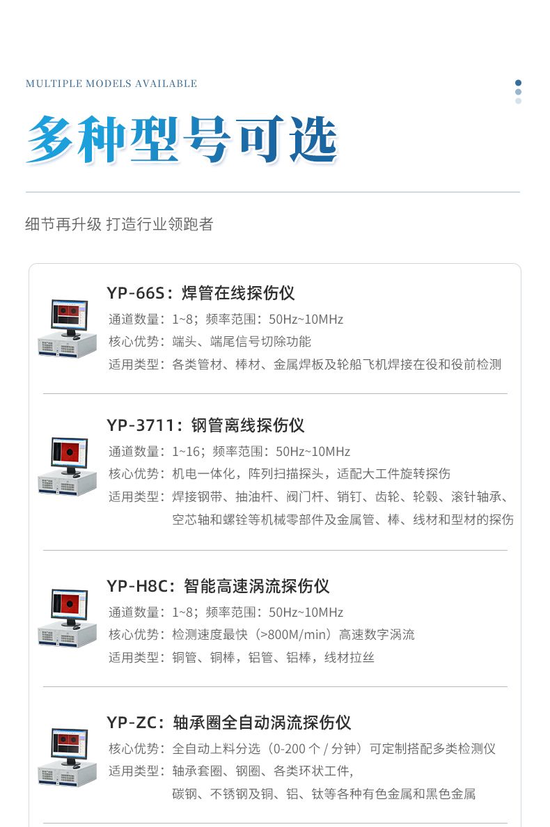 可配套渦流探傷儀、漏磁探傷儀、超聲探傷儀、磁記憶檢測(cè)儀、硬度儀等設(shè)備針對(duì)不同管徑不同要求搭配儀器。具體儀器參數(shù)詳見各儀器介紹。