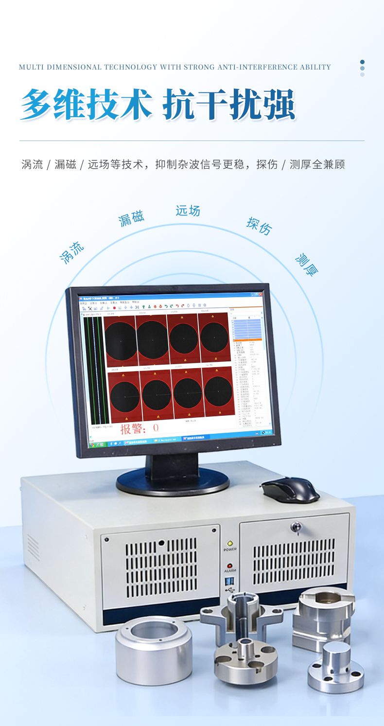 適用于無縫管、焊管等金屬管、棒、線材的在線、離線探傷,也可用于機械零部件的自動探傷,儀器同時備有差動、絕對通道,一個差動檢測突變?nèi)毕荩粋€絕對通道檢測緩變?nèi)毕?、長通傷;雙頻可以使用一個高頻檢測表面缺陷,一個低頻檢測內(nèi)部陷,保證較好的檢測效果。