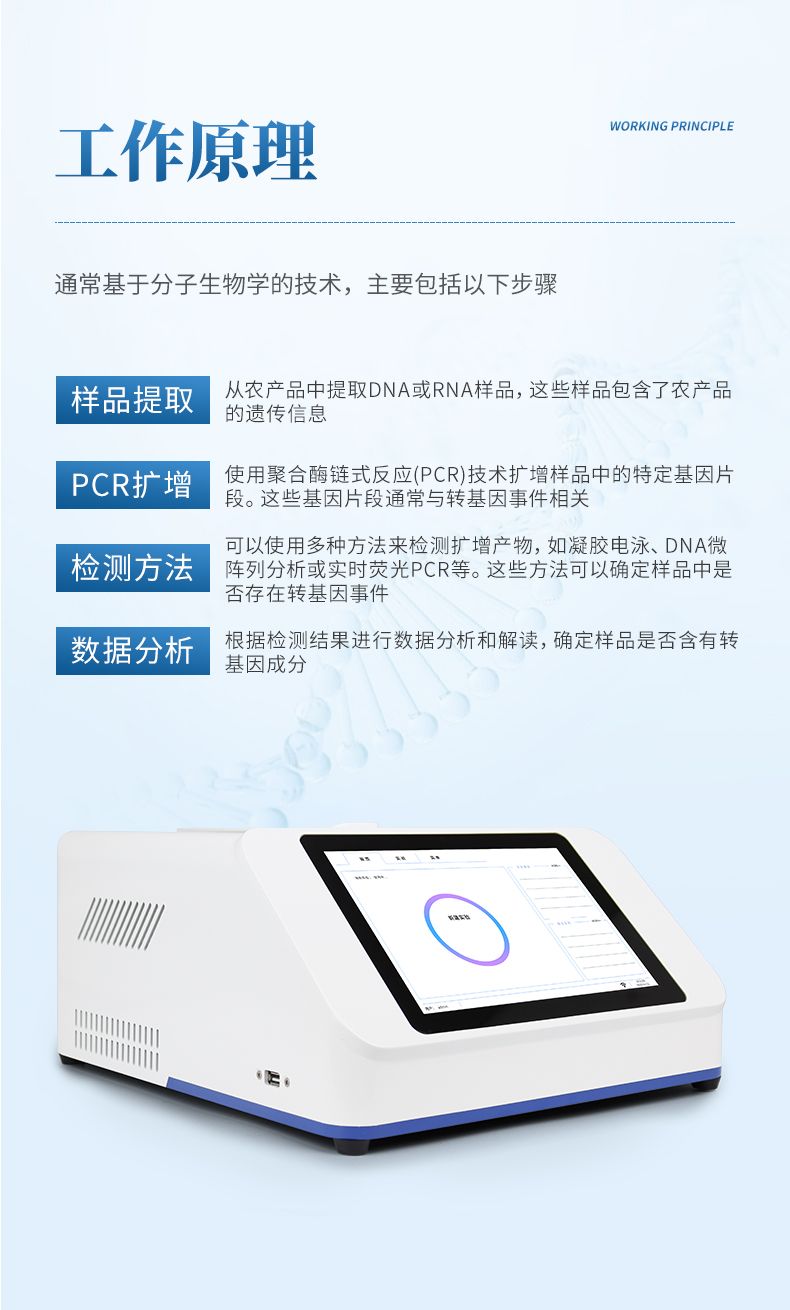 轉(zhuǎn)基因檢測儀的工作原理通常基于分子生物學(xué)的技術(shù),主要包括以下步驟: