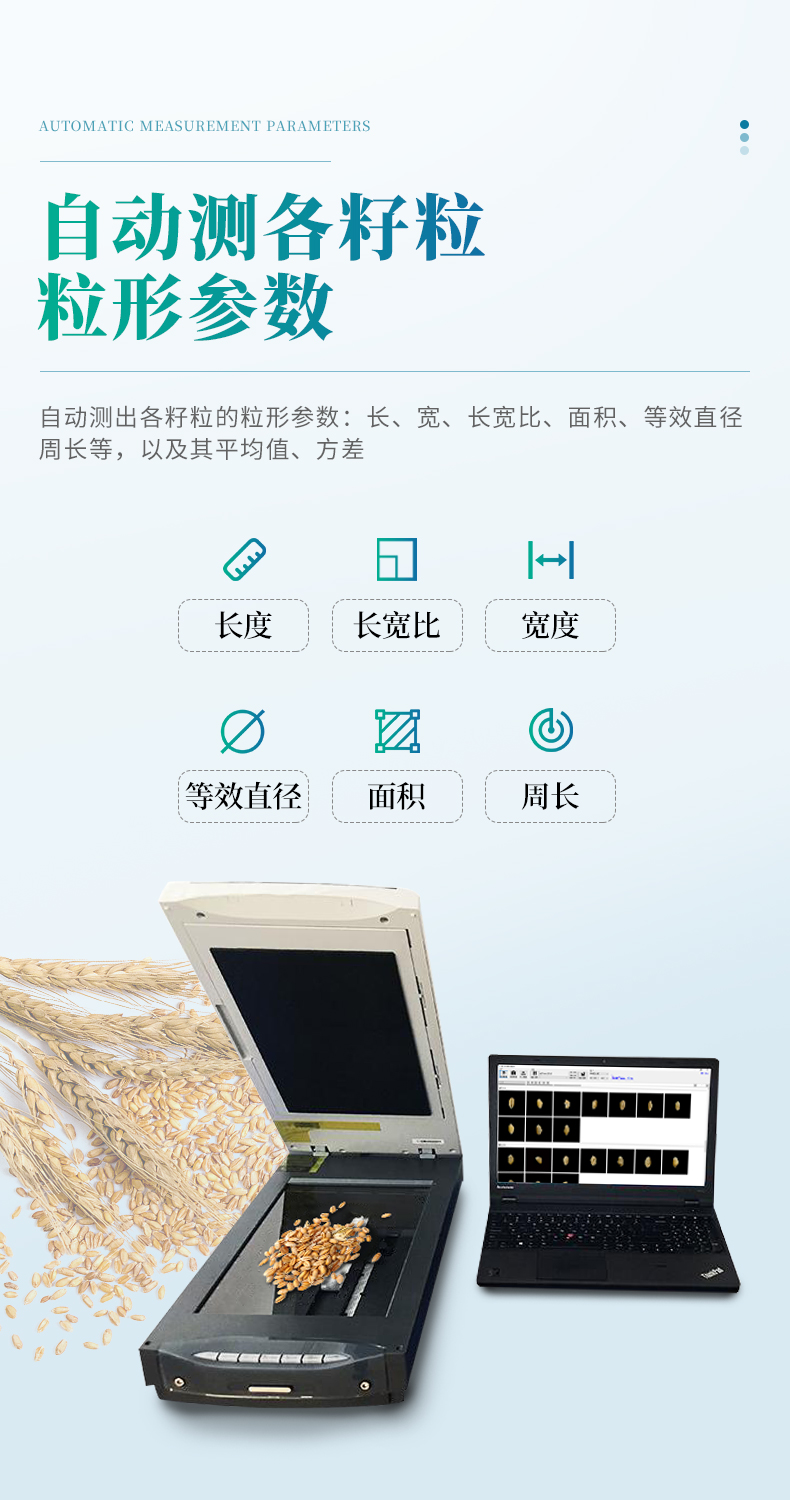 7.自動(dòng)測(cè)出各籽粒的粒形參數(shù):長(zhǎng)、寬、長(zhǎng)寬比、面積、等效直徑、周長(zhǎng)等,以及其平均值、方差