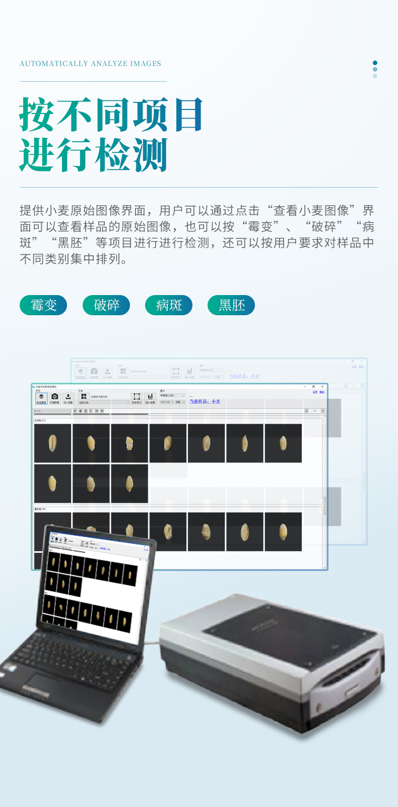 小麥不完善軟件連接專用掃描儀,掃描出小麥正反兩面的電子照片,通過(guò)軟件識(shí)別自動(dòng)對(duì)檢測(cè)的小麥樣品進(jìn)行計(jì)數(shù)分類計(jì)算。從而獲得整體小麥的分類品質(zhì)。