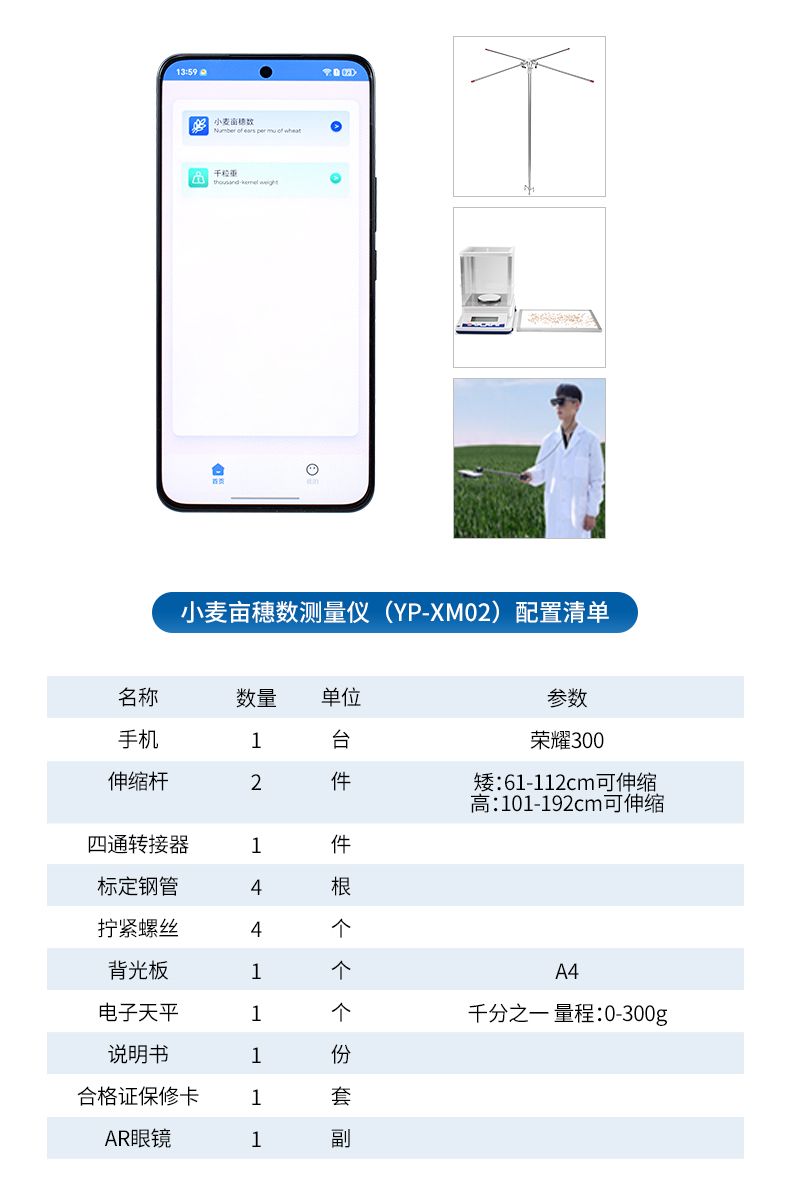 本設(shè)備適用于田間調(diào)查、育種選育、產(chǎn)量預(yù)估等多種應(yīng)用場(chǎng)景,為小麥的品種篩選、小麥產(chǎn)量預(yù)測(cè)、產(chǎn)量基因定位和功能解析發(fā)揮著至關(guān)重要的作用。可顯著減少人工計(jì)數(shù)帶來(lái)的誤差與勞動(dòng)強(qiáng)度。用戶(hù)只需在田間選定樣方區(qū)域,拍攝圖像后即可自動(dòng)獲得畝穗數(shù)估算結(jié)果,是農(nóng)業(yè)數(shù)字化與智能化發(fā)展的有力工具。