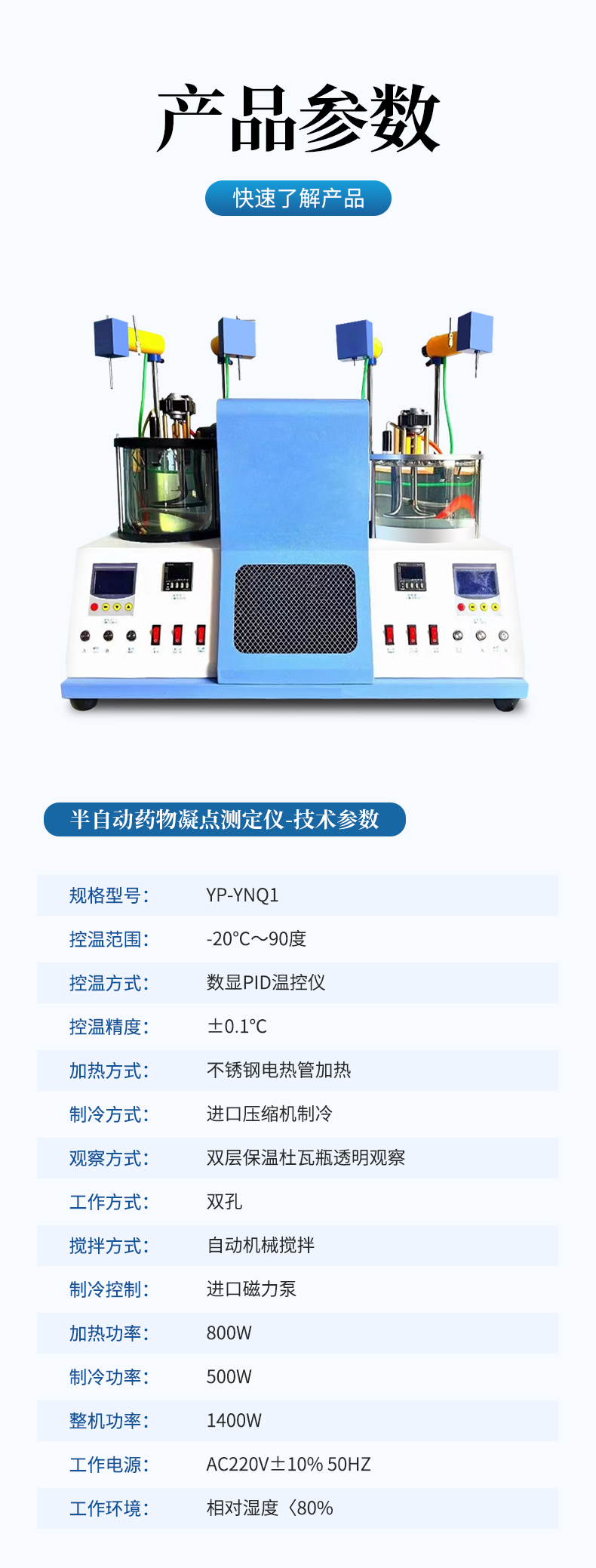 本儀器按《中華人民共和國(guó)藥典》2020年版四部 通則 0613凝點(diǎn)測(cè)定法要求設(shè)計(jì)制造,用于檢測(cè)化學(xué)試劑及藥物等凝固點(diǎn)。本儀器采用了模塊化設(shè)計(jì),檢測(cè)部分采用了先進(jìn)的傳感器,主控部分采用工業(yè)級(jí)PLC系統(tǒng),控制性能穩(wěn)定,制冷采用高性能壓縮機(jī),具有降溫速度快,使用壽命長(zhǎng)等優(yōu)點(diǎn)。本儀器采用工業(yè)控制屏操作,樣品裝好后,一鍵開(kāi)啟,自動(dòng)往返式機(jī)械攪拌、自動(dòng)顯示溫度曲線、自動(dòng)判斷凝固點(diǎn)、自動(dòng)打印測(cè)試數(shù)據(jù)。本儀器配有加熱和制冷,介質(zhì)浴溫控范圍廣。