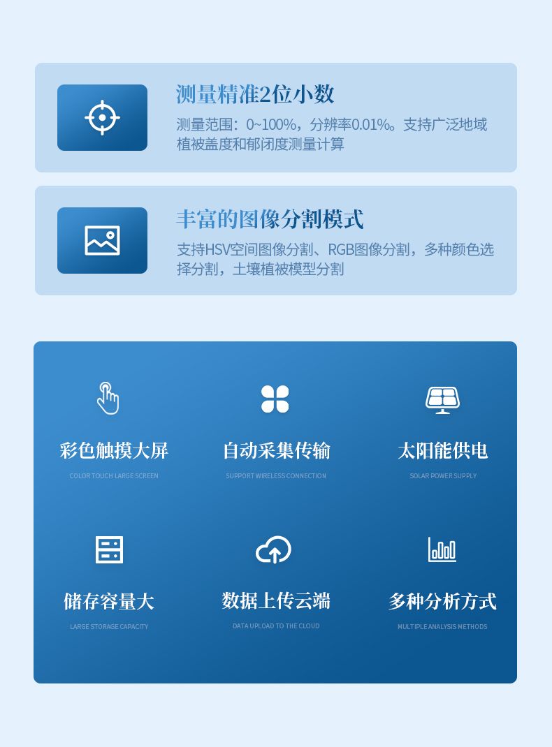 10. 多種分析方式,支持自動(dòng)分析,手動(dòng)RGB閾值分割分析、手動(dòng)HSV閾值分割分析,圖片選色分析,植被土壤模型分析,測(cè)量準(zhǔn)確度:≥90%。