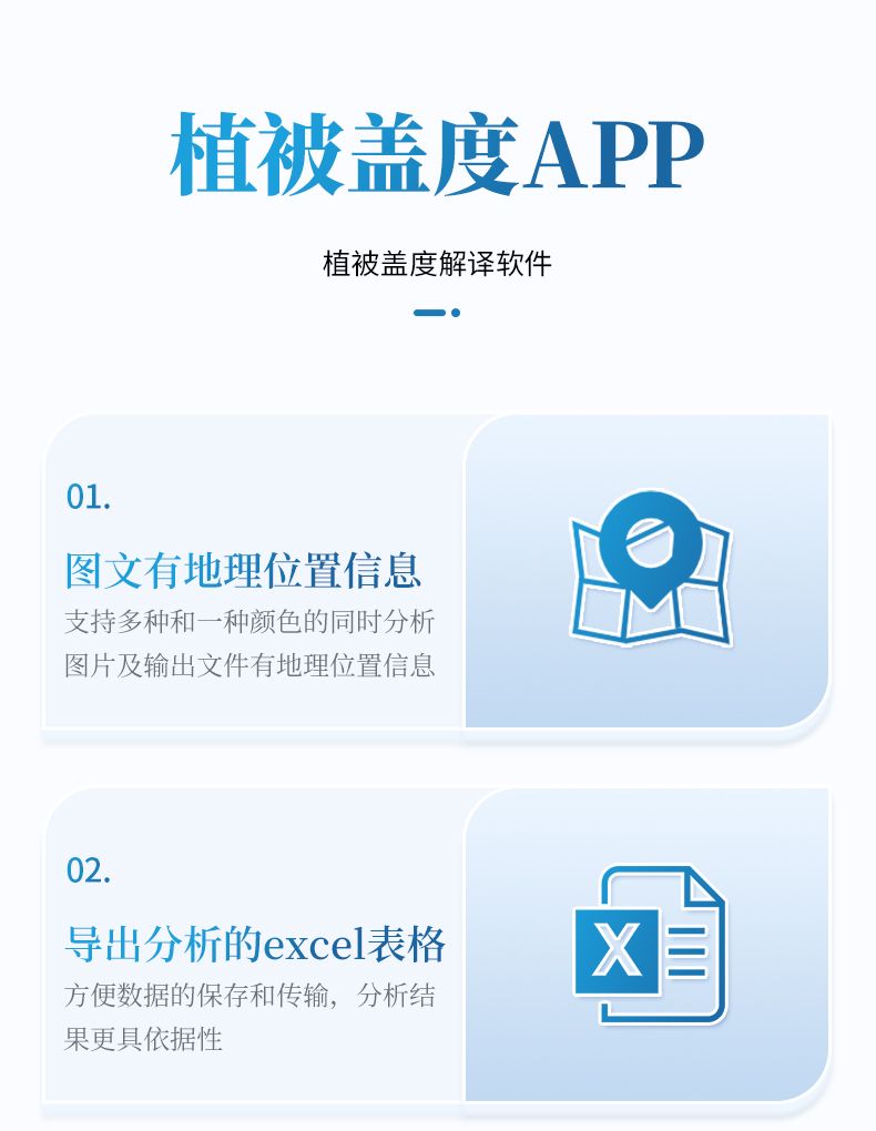 1. 適配安卓移動(dòng)客戶端, 軟件提供豐富的圖像分割模式,軟件內(nèi)置植被、土壤特征模型,支持廣泛地域植被蓋度和郁閉度測(cè)量計(jì)算。