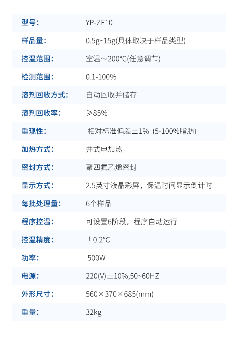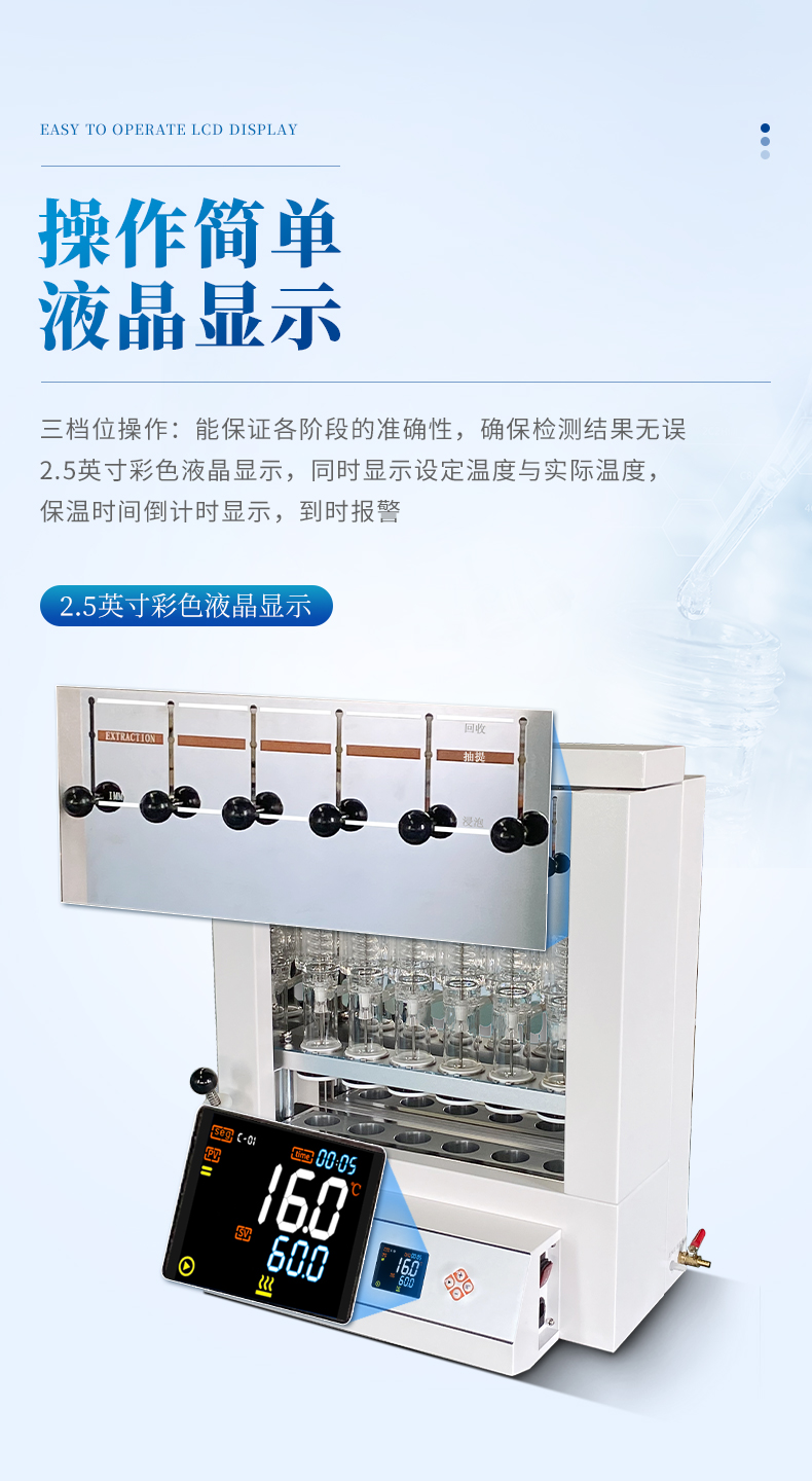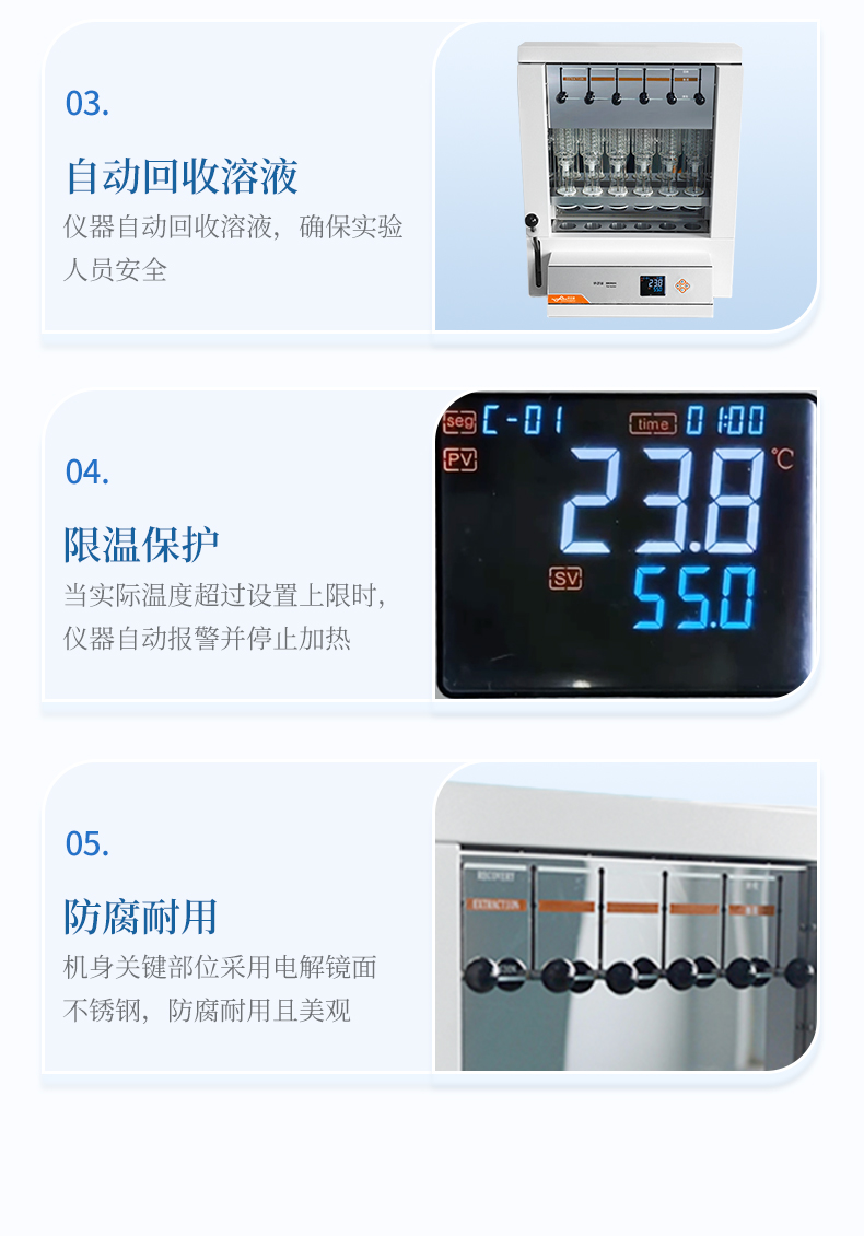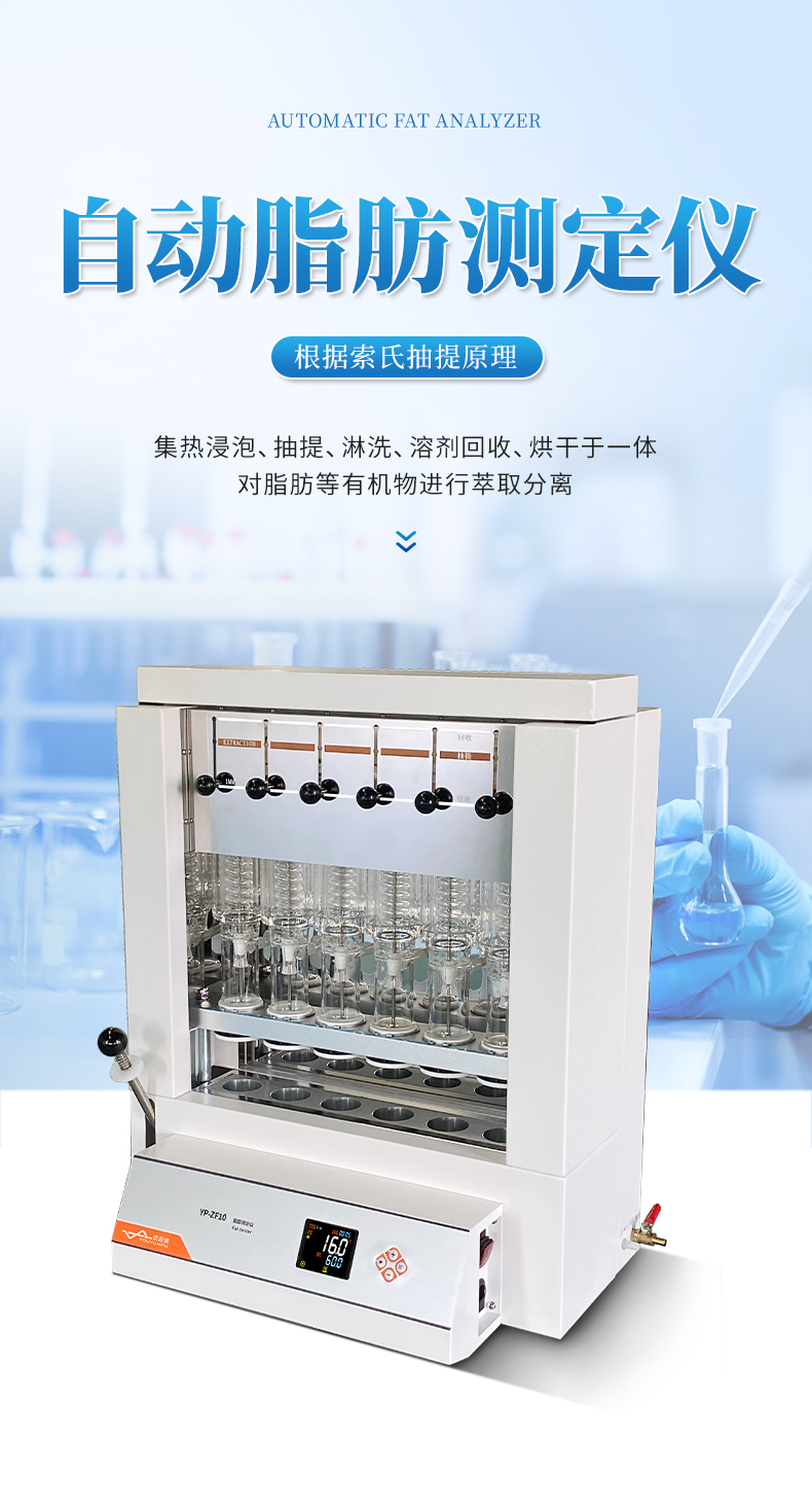 自動脂肪測定儀(索氏提取儀)是根據(jù)索氏抽提原理,集熱浸泡、抽提、 淋洗、溶劑回收、烘干于一體,對脂肪等有機(jī)物進(jìn)行萃取分離的儀器。儀器采用了自 動控溫、全封閉井式電加熱形式,使儀器加溫更為均勻,安全可靠,并具有良好的密 封設(shè)施,從而達(dá)到快速準(zhǔn)確的目的;最大限度降低溶劑用量,自動回收溶劑,節(jié)省分 析成本。具有設(shè)計合理、操作簡單、精確度高、性能穩(wěn)定、重現(xiàn)性 好、省力、省時等優(yōu)點(diǎn)。