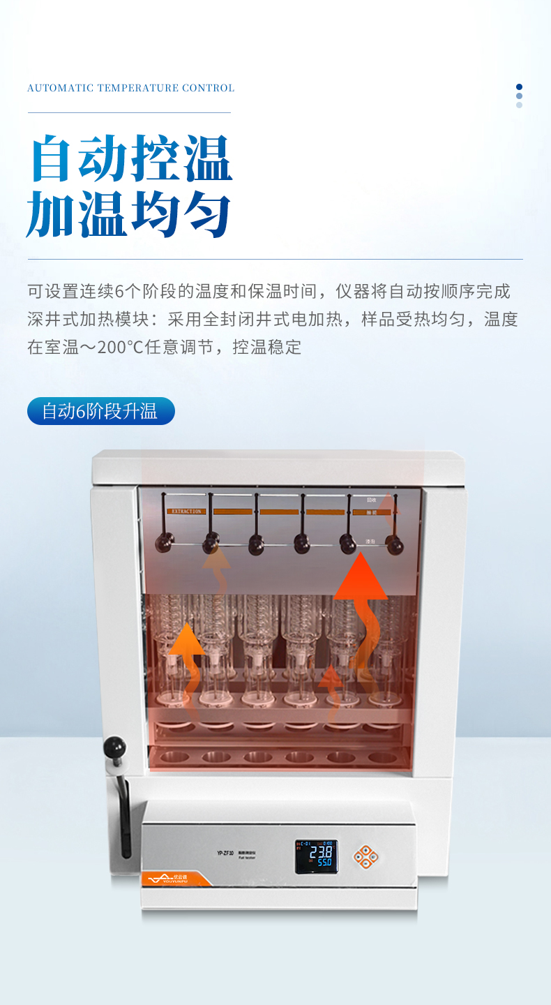4.深井式加熱模塊:采用全封閉井式電加熱,樣品受熱均勻,溫度在室溫~200℃任意調(diào)節(jié),控溫穩(wěn)定;