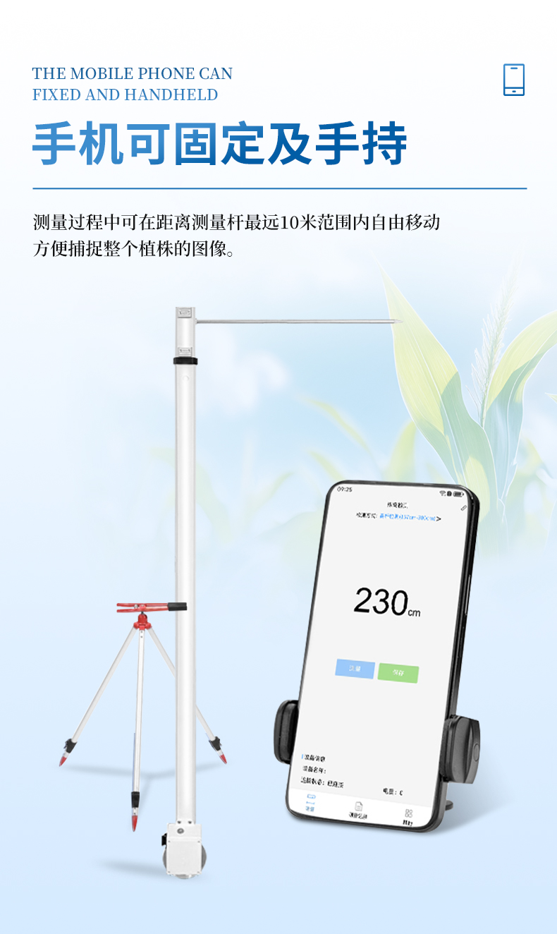 5.靈活性強 - 手機可以固定或者手持操作,測量過程中可在距離測量桿最遠10米范圍內(nèi)自由移動,方便捕捉整個植株的圖像。