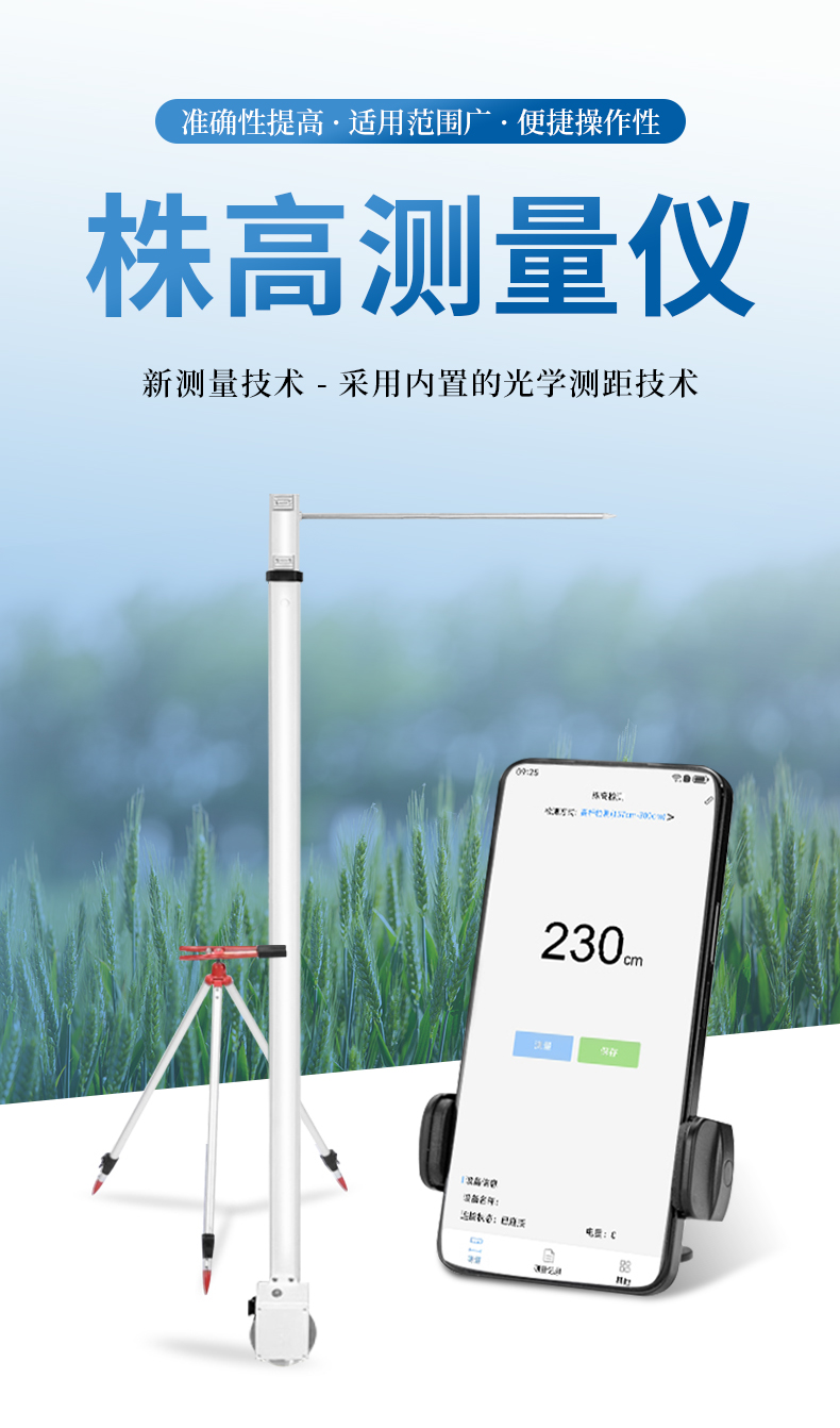 作物株高測量儀是專為農(nóng)業(yè)領(lǐng)域設(shè)計的一種便攜式、快速響應(yīng)的農(nóng)作物高度測量工具。采用光學(xué)測距技術(shù),并通過內(nèi)置算法進行現(xiàn)場分析,能夠?qū)崟r獲取作物的高度數(shù)據(jù)。
