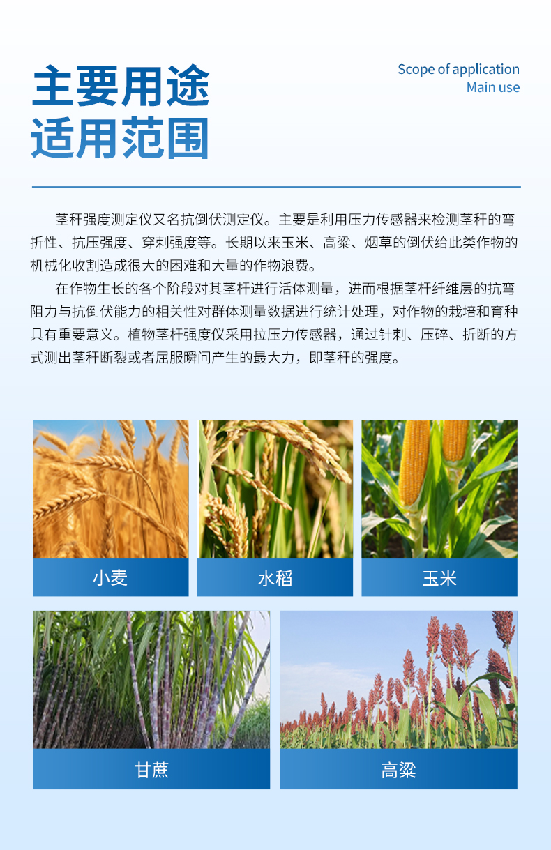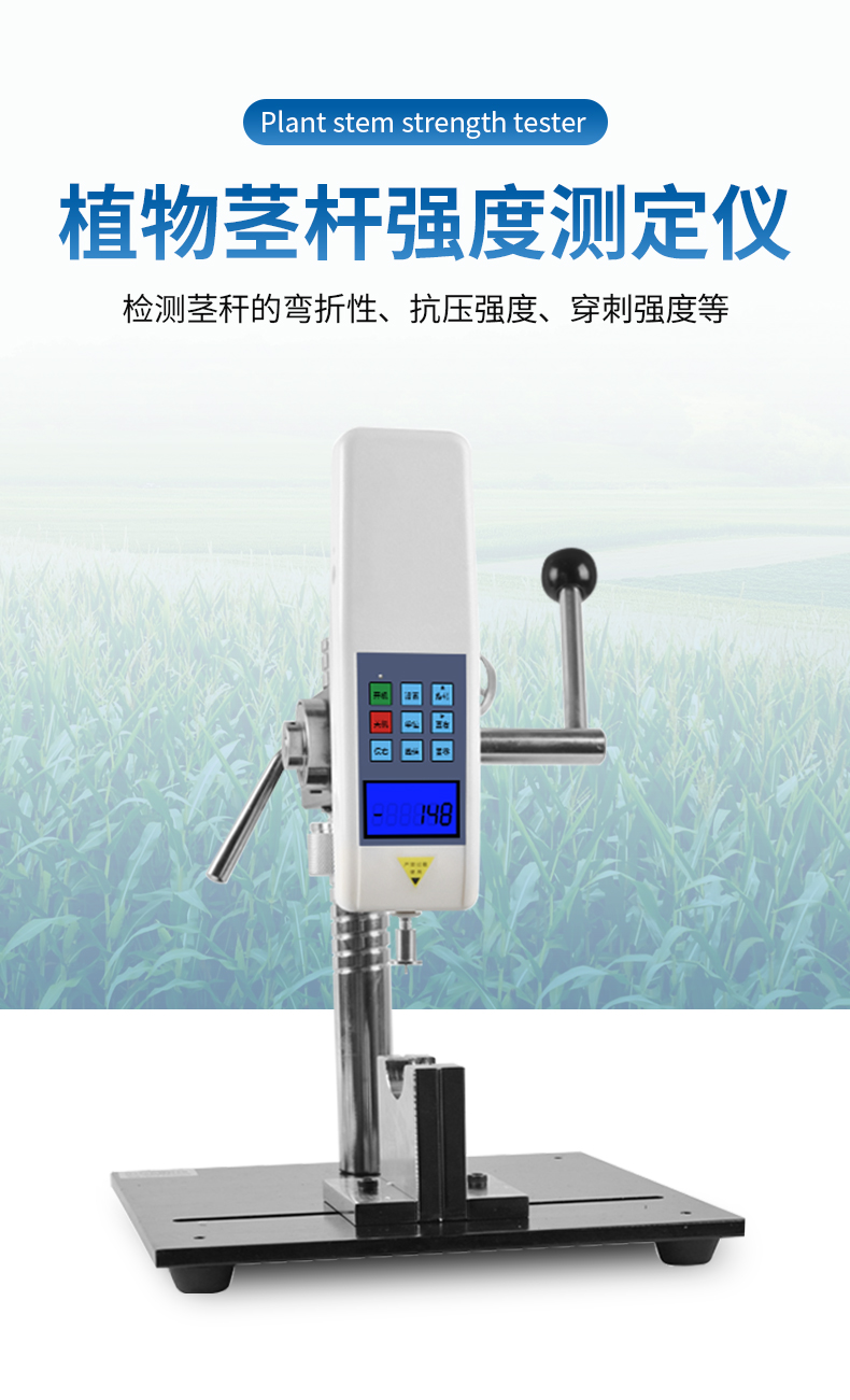 植物莖稈的強度是決定作物抗倒伏能力的一個主要因素,長期以來玉米,高梁、煙草等的倒伏給作物的機械收割造成很大的困難。從機械化水平來說,造成大量的糧食浪費。另外,作物倒伏導致光照不充分,使其生產(chǎn)量受到極大的限制。在作物生長的各個階段對其莖稈進行活體測量,進而根據(jù)莖桿纖維層的抗彎阻力與抗倒伏能力的相關性對群體測量數(shù)據(jù)進行統(tǒng)計處理,對作物的栽培和育種具有重要意義。植物莖稈強度儀采用拉壓力傳感器,通過針刺、壓碎、折斷的方式測出莖稈斷裂或者屈服瞬間產(chǎn)生的最大力,即莖稈的強度。