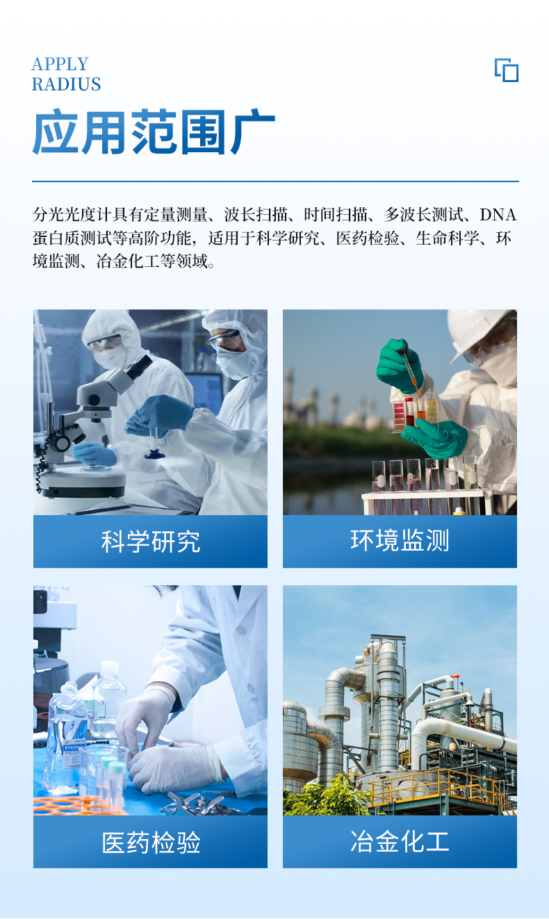 分光光度計具有定量測量、波長掃描、時間掃描、多波長測試、DNA蛋白質(zhì)測試等高階功能,具有高精度、高分辨率、低噪聲、低雜散光的特點,特別適用于科學研究、醫(yī)藥檢驗、生命科學、環(huán)境監(jiān)測、冶金化工等領(lǐng)域。