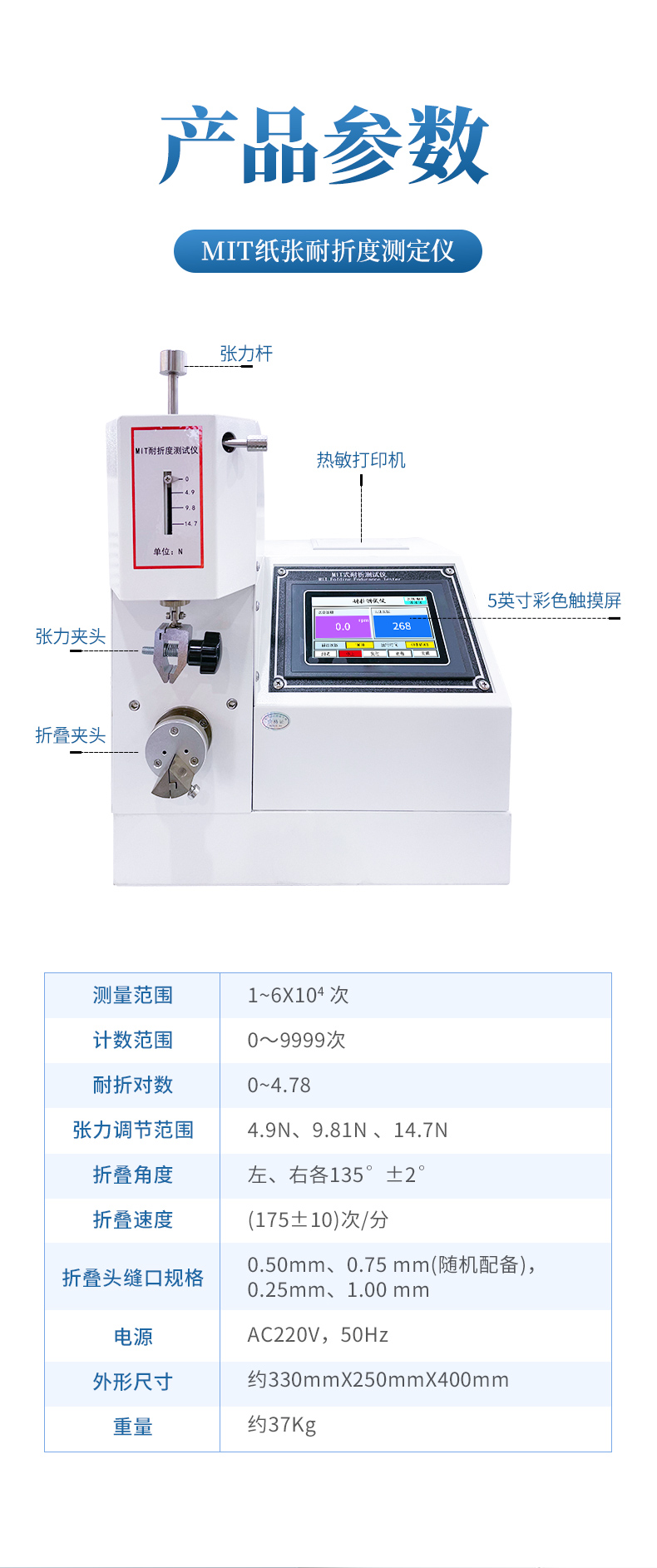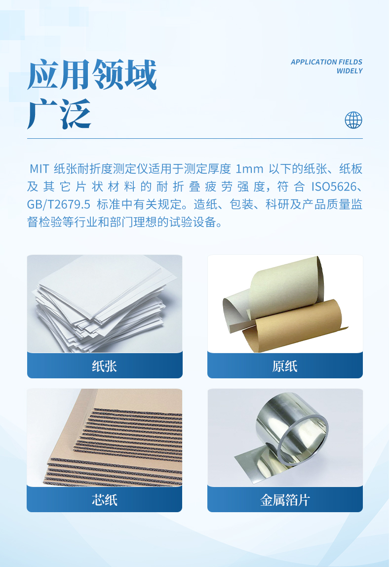 MIT紙張耐折度測定儀適用于測定厚度1mm以下的紙張、紙板及其它片狀材料的耐折疊疲勞強(qiáng)度,符合ISO5626、GB/T2679.5標(biāo)準(zhǔn)中有關(guān)規(guī)定。造紙、包裝、科研及產(chǎn)品質(zhì)量監(jiān)督檢驗(yàn)等行業(yè)和部門理想的試驗(yàn)設(shè)備。